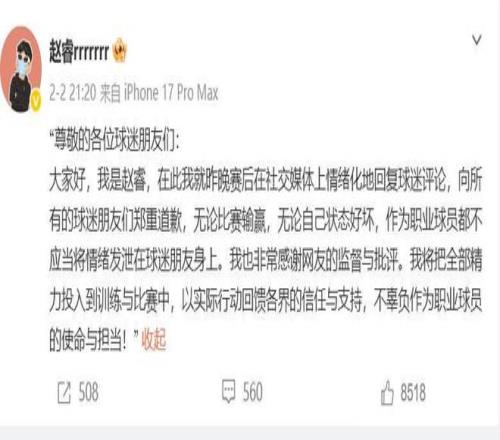 之前赵睿就曾在北京输给青岛的赛后,在评论区口不择言,说了一些不当言论攻击新疆球迷,从而引发了不小的风波,那件事闹得沸沸扬扬,不少新疆当地的官媒都亲自下场声讨赵睿,最终,CBA联赛在时隔多天后对赵睿开出了“重磅”处罚,对赵睿开出了停赛3场,罚款5万的罚单,北京首钢俱乐部被核减联赛经费5万,这件事才最后不了了之。