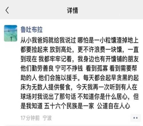 结合这两人的赛后发文加上现场球迷的说法,不难推断,李祥波肯定是在比赛期间对鲁吐布拉说了一些带有地域歧视的词汇,这才导致后者如此情绪激动,并且据鲁吐布拉的讲述,李祥波肯定不单单是侮辱了鲁吐布拉本人,还辱骂了整个新疆,这也是鲁吐布拉和刘家成之所以如此暴怒的原因。